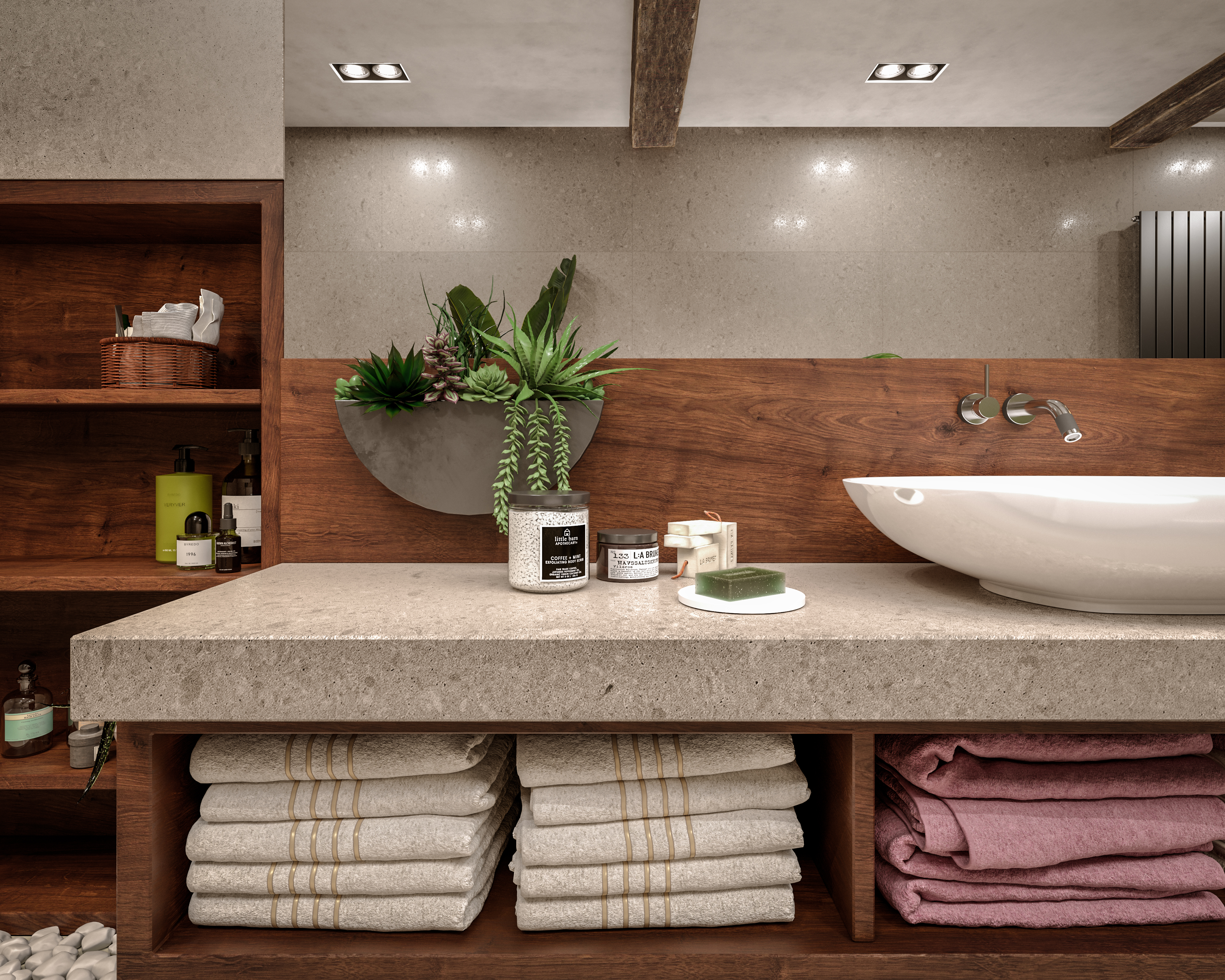 Odporność na wilgoć i plamy – konglomerat nie chłonie wody ani kosmetyków.